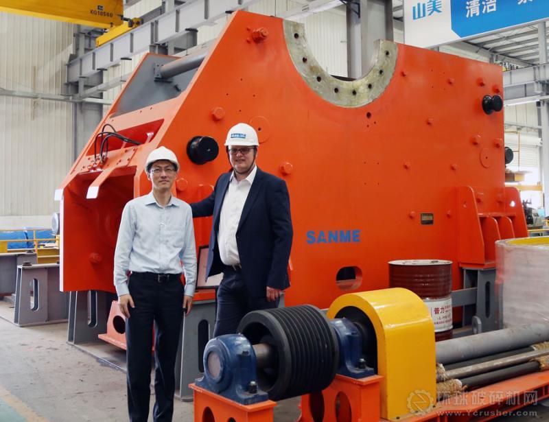 來訪客人還在山美股份相關領導的陪同下,參觀了山美股份的生產車間,重點了解了建筑垃圾資源化處理設備的生產情況,包括移動式處理設備,反擊式破碎機,振動篩等。德國哈茲馬克公司副總Nijland先生饒有興趣與山美股份生產的大型顎式破碎機JC663合了影。