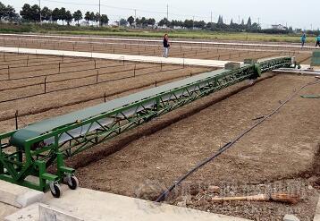 一種是長距離無立柱秧田用秧盤輸送機(如圖1、圖2),該機具不要立柱支撐就可以橫跨大面積秧田,作業者在秧田工作區域就可以通過輸送帶完成秧盤的上下搬運工作,不需要在秧田與田埂之間來回走動,省去了由人工搬運所帶來的麻煩,極大的降低了勞動強度,提高工作效率,并且降低操作成本,避免了在人工搬運過程中造成對秧苗的損傷,影響秧苗生長的問題。