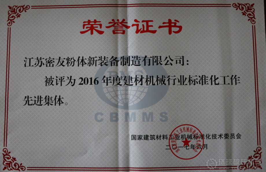 近期,密友粉體裝備制造榮獲2016年度建材機械行業標準化工作先進集體榮譽證書。
