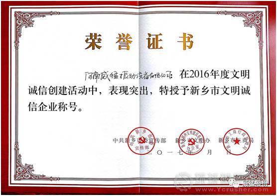 近日,河南威猛振動被中共新鄉市委宣傳部、新鄉市文明辦、新鄉市工商局授予“2016年度新鄉市文明誠信企業”榮譽稱號。