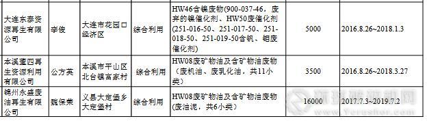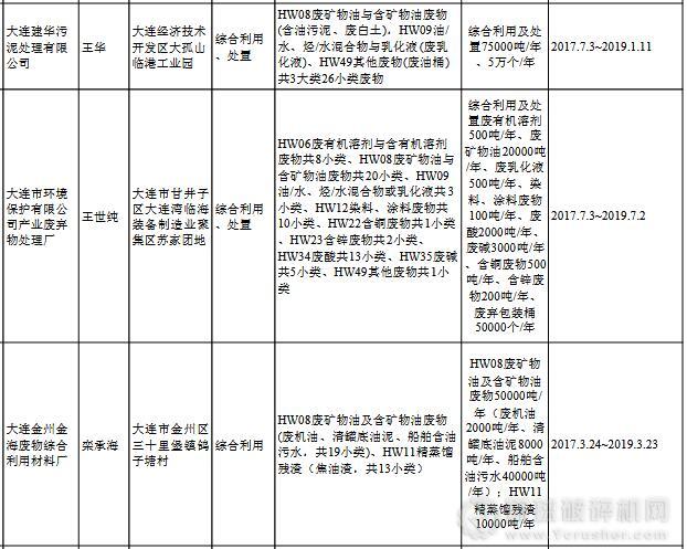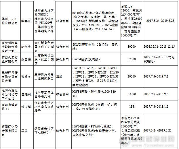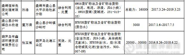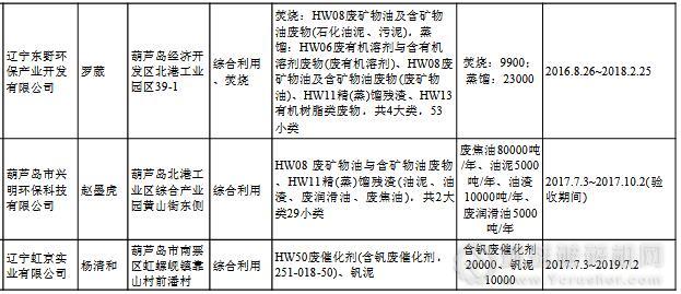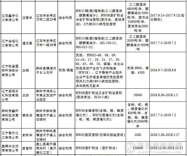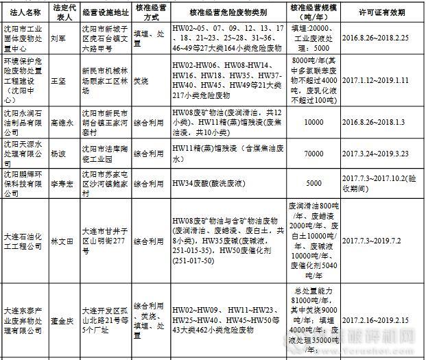 近日,遼寧省環保廳印發了遼寧省危廢經營許可證持單位名單(截止2017年7月3日),包括沈陽市工業固體廢物處置中心、環境保護危險廢物處置工程建設(沈陽中心)等33家企業,具體如下: