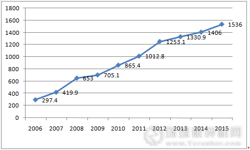 2006-2015年危險廢物實際經營規模(萬噸)