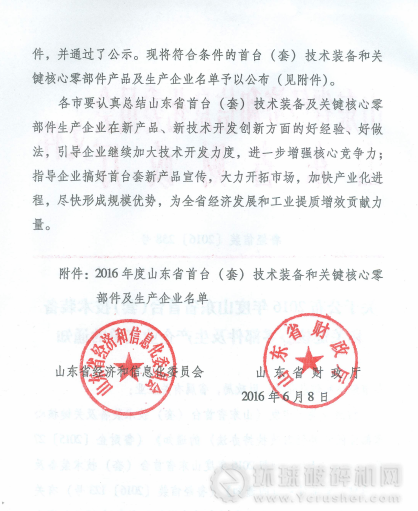 近期,山東省經濟和信息化委員會公布了山東省內獲得2016年度國內首臺(套)技術裝備和關鍵核心零部件項目的企業名單,棗莊市金山機械股份有限公司名列其中,金山機械JSPCD型臺時3000噸智能控制礦物破碎機經過嚴格的檢驗,通過了重重審核,最終獲得“2016年度國內首臺(套)技術裝備及關鍵核心零部件”殊榮。