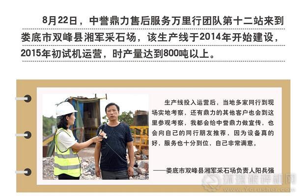 據該生產線負責人陽兵強介紹,自己是婁底市第一個“吃螃蟹”的人,是第一個使用中譽鼎力PCZ1615重型錘式破碎機的人。當時婁底市幾家生產線都要購買設備,因為大家原來沒有接觸和使用過中譽鼎力的設備,沒有人愿意購買。自己當時聽了中譽鼎力銷售經理的介紹,覺得設備還比較符合生產線的要求,又實地考察了中譽鼎力在湖南的兩條正在運營的生產線,就決定采用鼎力的全套設備。事實證明,自己的選擇沒有錯。生產線設計的時產量為800噸,在實際生產中可以達到時產1000噸,所產石料粒型較好,生產的精品成品砂可以滿足長沙等地的高鐵、高速路等建設需求。同時,與原來選用的設備對比,鼎力的設備節能效果比較顯著。
