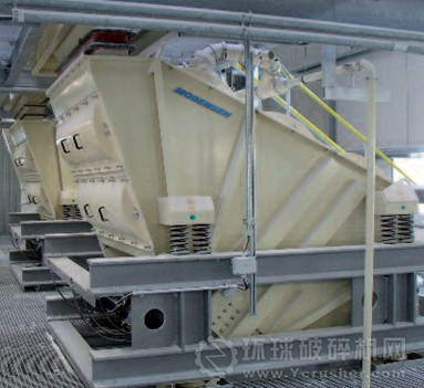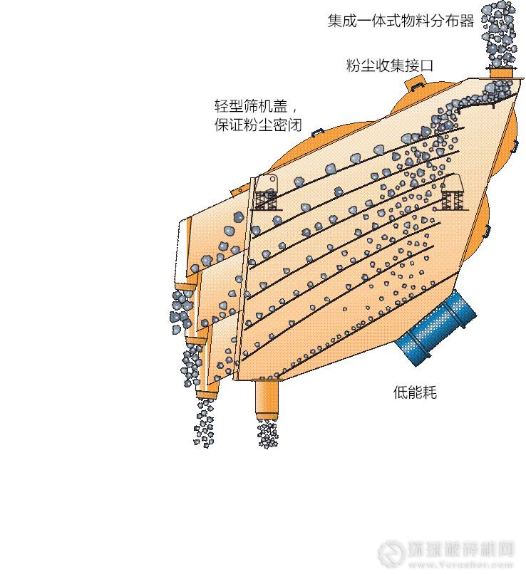 篩機由2-6層孔徑從大到小、維修簡單的篩網(wǎng),從上而下,按不同的傾角、一層一層地裝在一個緊湊的鋼結(jié)構(gòu)中,由振動電機或者勵磁電機驅(qū)動。當(dāng)物料進入篩機后,細顆粒在經(jīng)過上層粗孔徑篩網(wǎng)時,便能立即(幾乎是垂直)通過,而粗料便被篩除。由于每層篩網(wǎng)都有一個傾角,所以每層篩網(wǎng)在水平面投影的孔徑都比篩網(wǎng)實際的孔徑小。所以與傳統(tǒng)的平置篩網(wǎng)相比,可以選擇較大孔徑的篩網(wǎng),以達到更好的篩分。