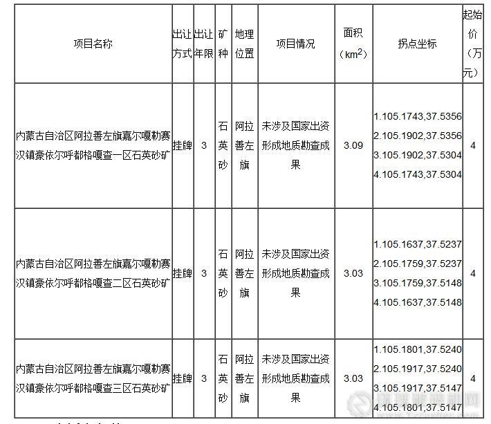根據相關法律、法規的規定,內蒙古自治區公共資源交易管理服務中心(以下簡稱“交易管理中心”)按照內蒙古自治區國土資源廳《關于掛牌出讓阿拉善左旗嘉爾嘎勒賽漢鎮豪依爾呼都格嘎查一區石英砂等三宗探礦權的函》(內國土資字〔2017〕337號)的要求,對“阿拉善左旗嘉爾嘎勒賽漢鎮豪依爾呼都格嘎查一區石英砂等三宗探礦權”以掛牌方式出讓。