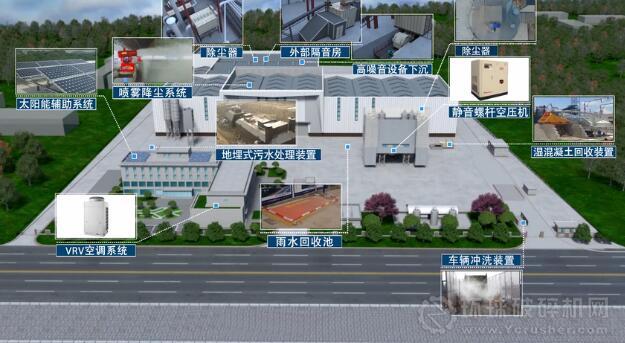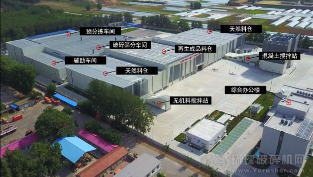 廠區(qū)主要由預(yù)分揀車間、破碎篩分車間、輔助車間、配料倉(cāng)、再生成品料倉(cāng)、天然料倉(cāng)、無(wú)機(jī)料攪拌站、混凝土攪拌站、綜合辦公樓、試驗(yàn)調(diào)度中心以及鍋爐房等組成。