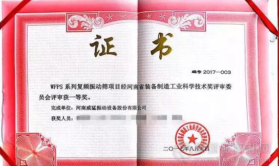 威猛股份研發生產的“WFPS系列復頻振動篩項目”于2017年8月9日經河南省裝備制造工業科學技術獎評審委員會評審獲得一等獎。