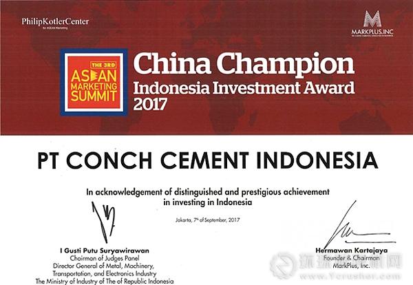 9月7日,東盟營銷峰會在印尼雅加達萊弗士酒店舉行,印尼海螺公司榮獲峰會2017年度印尼投資中國企業冠軍獎“China Champion for Indonesia”Award 2017,該獎項是綜合考慮印尼中央部委BKPM、工業部、貿易部、勞工部等內部數據,聯合評選得出,代表中國在印尼投資最高水平。