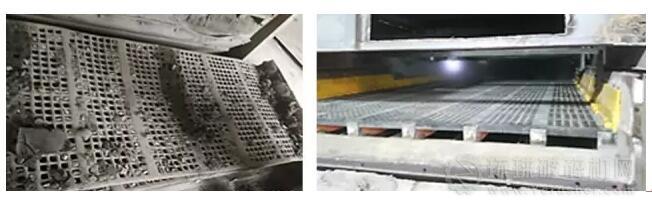 下層篩網改造前后對比:左圖聚氨酯篩網堵礦嚴重,右圖美卓T40橡膠篩板使用11個月后幾乎沒有堵礦。