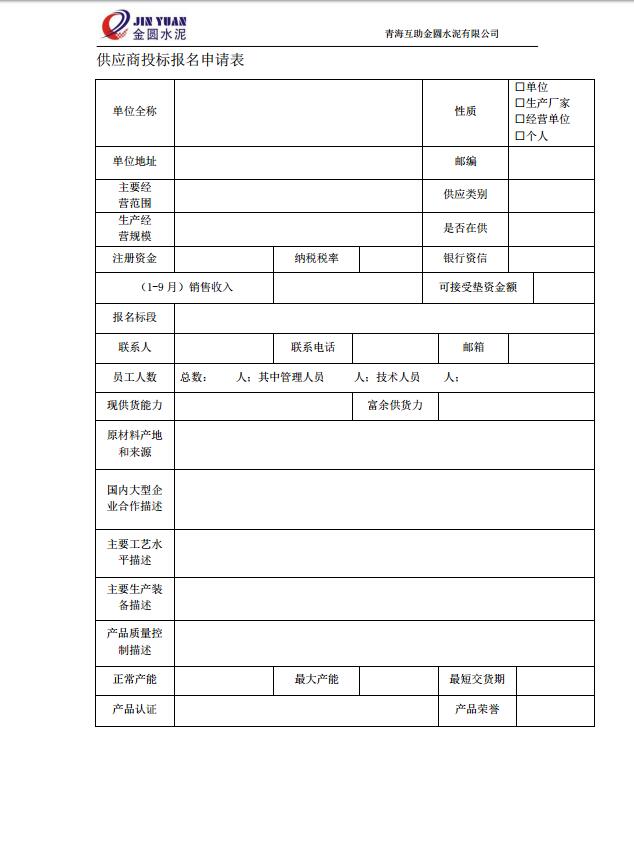 投標單位自主報名,經中國砂石協會及互助金圓金圓水泥有限公司資質審核小組預審,通過資質預審合格投標單位方能受邀參加招標。