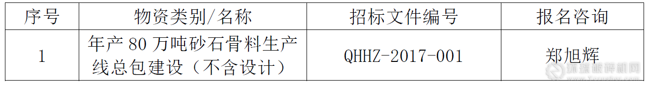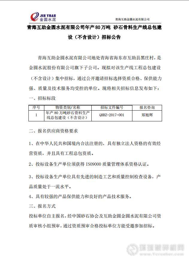 環球破碎機網訊:近日,青海互助金圓水泥有限公司發布了年產80萬噸砂石骨料生產線總包建設(不含設計)招標公告,具體詳情如下:
