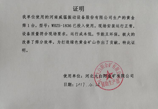 日前,威猛股份與河北大白陽金礦有限公司簽約,簽約設備黃金篩WHZS-1836 1臺投入使用,現場安裝運行正常,極大改善了篩分效率。