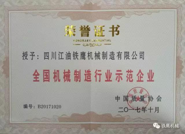 近日,中國質量協會授予四川江油鐵鷹機械制造有限公司“全國機械制造行業示范企業”稱號。