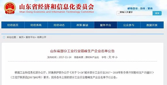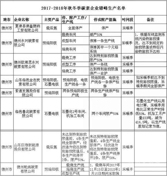 2017-2018年秋冬季碳素企業錯峰生產名單(德州)