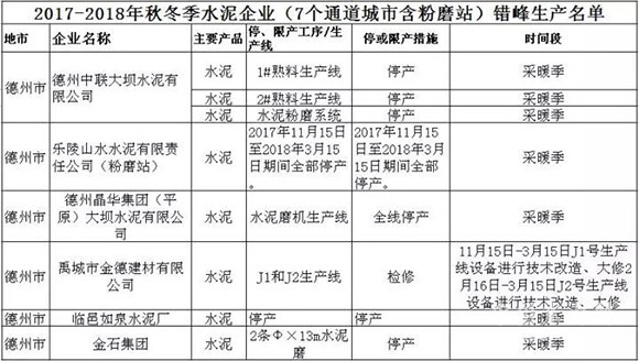 2017-2018年秋冬季水泥企業錯峰生產名單(德州)