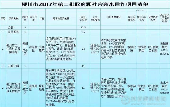 11月25日,廣西柳州市發改委公布了柳州市2017年第二批政府和社會資本合作模式項目(PPP項目)清單,共為2個項目、總投資12.5億元,期待各方社會資本積極參與。