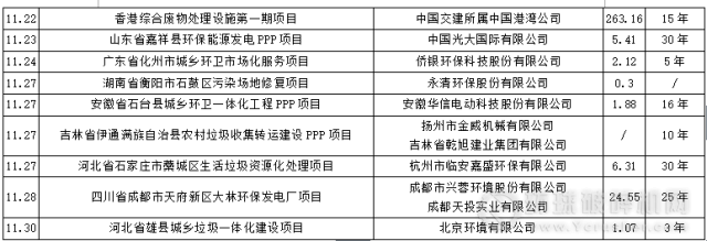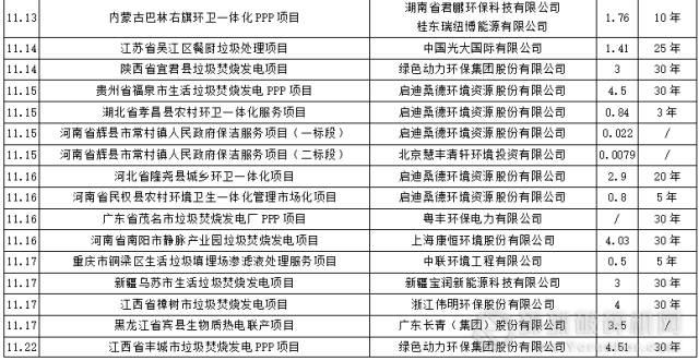 11月,涉及的14個環衛項目中,合作期限10年以下的有6個,分別為內蒙古巴林右旗環衛一體化PPP項目、湖北省孝昌縣農村環衛一體化服務項目、河南省民權縣農村環境衛生一體化管理市場化項目、廣東省化州市城鄉環衛市場化服務項目、吉林省伊通滿族自治縣農村垃圾收集轉運建設PPP項目和河北省雄縣城鄉垃圾一體化建設項目。