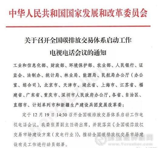國家發改委近日發布《關于召開全國碳排放權交易體系啟動工作電視電話會議的通知》,定于12月19日14:30召開全國碳排放權交易體系啟動工作電視電話會議,國家發改委張勇副主任將出席,就落實全國碳排放權交易市場建設方案,推動全國碳排放權交易市場建設有關工作進行動員部署。