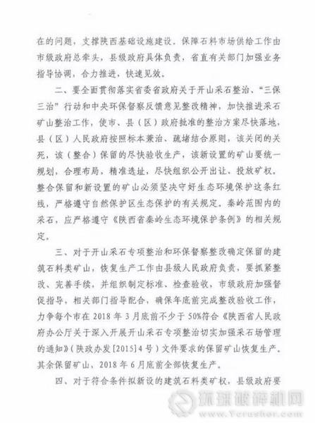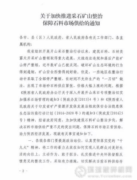 《通知》根據當前砂石行業行情,依據《陜西省人民政府辦公廳關于深入開展開山采石專項整治切實加強采石場管理的通知》和《陜西省人民政府關于印發省礦產資源開發保發展治粗放保安全治隱患保生態治污染行動計劃(2016-2020年)的通知》精神,為加快建筑石料礦山整治步伐,解決石料市場供應嚴重不足的突出問題,保障石料市場正常供給,助力陜西經濟發展。做出如下通知要求: