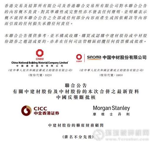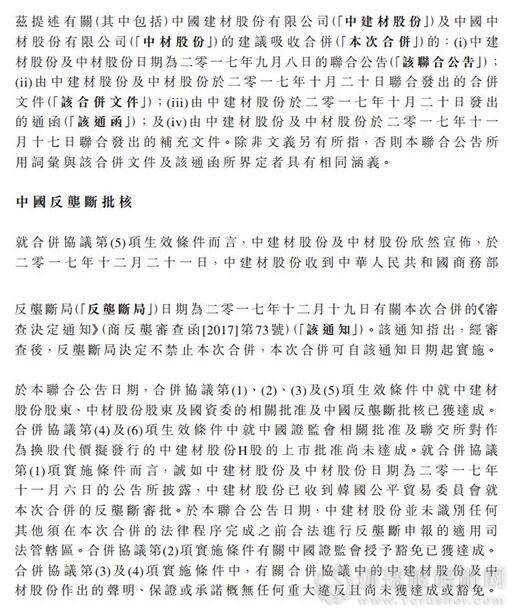 中國建材(03323)與中材股份(01893)聯合公布,2017年12月21日,中建材股份收到中國商務部反壟斷局日期為2017年12月19日有關此次合并的《審查決定通知》,經審查后,反壟斷局決定不禁止此次合并,此次合并可自該通知日期起實施。