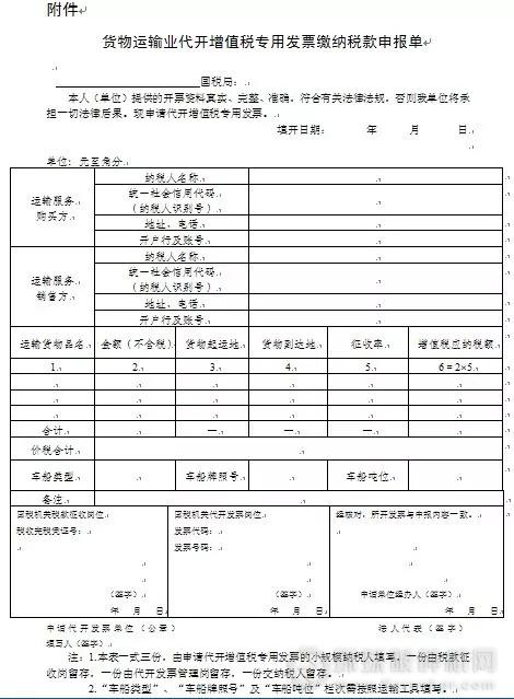 1、《貨物運(yùn)輸業(yè)代開(kāi)增值稅專用發(fā)票繳納稅款申報(bào)單》。
