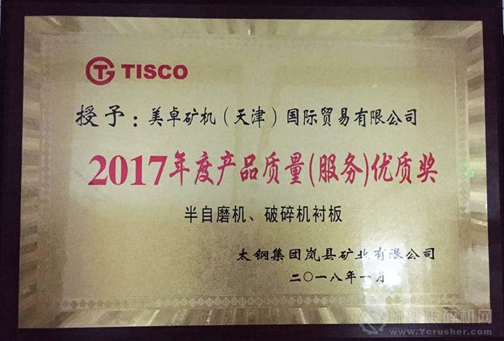 2018年2月16日,太鋼袁家村鐵礦在2018年產品質量提升專題會上,對2017年度袁家村鐵礦主體設備旋回破碎機、半自磨機、球磨機以及渣漿泵等關鍵設備的襯板、過流件等大型備件使用情況進行了通報,并對優(yōu)質廠商提出了表彰。美卓憑借卓越的產品質量和出眾的服務,榮獲“太鋼2017年度產品質量(服務)優(yōu)質獎”。