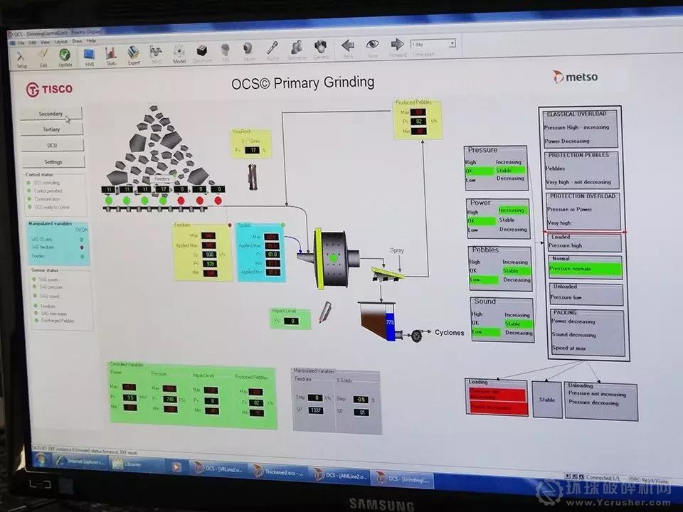 示例:在太鋼袁家村鐵礦,三條磨礦生產(chǎn)線均采用美卓的OCS專家控制系統(tǒng),配備AudioMill磨音分析儀和VisioRock塊度成像分析儀。自動化系統(tǒng)平穩(wěn)運行1年半后,經(jīng)測算,三條生產(chǎn)線平均產(chǎn)能提高約10%,工藝指標更加穩(wěn)定,磨礦的球耗及電耗降低,極大地緩解了操作人員的勞動強度。