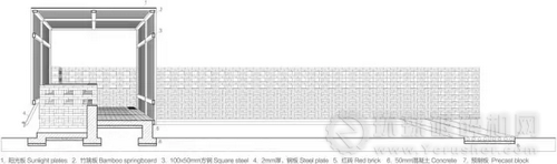 建筑主體為紅磚基礎(chǔ)、方鋼框架、竹跳板表皮三重結(jié)構(gòu)。