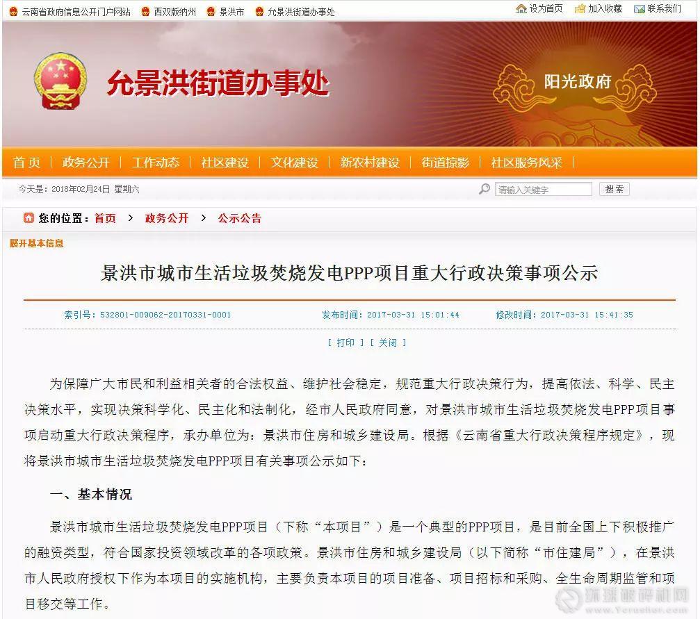 最終,我們在云南省政府信息公開門戶網(wǎng)站上的一則公示中找到了答案——《景洪市城市生活垃圾焚燒發(fā)電PPP項目重大行政決策事項公示》
