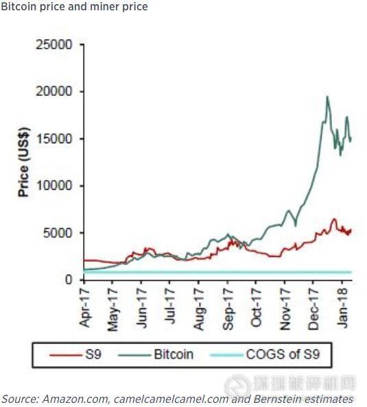 根據伯恩斯坦的估計,比特幣去年底價格猛漲至20,000美元,比特大陸的AntMiner S9價格攀升至5,000美元左右,而生產成本保持不變。