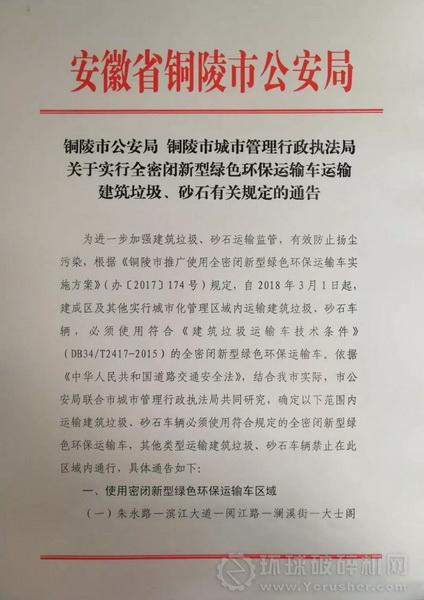 銅陵市公安局、銅陵市城市管理行政執(zhí)法局,關于實行全密閉新型綠色環(huán)保運輸車、運輸建筑垃圾、砂石有關規(guī)定的通告