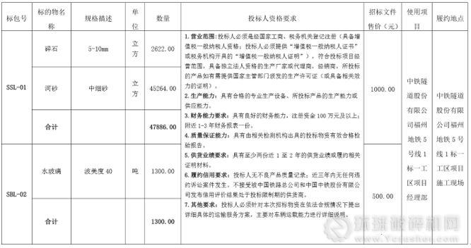 中鐵隧道股份有限公司承建福州地鐵5號線1標(biāo)一工區(qū)項(xiàng)目,建設(shè)資金已經(jīng)落實(shí),項(xiàng)目所需砂石料、水玻璃已具備招標(biāo)條件,現(xiàn)進(jìn)行公開招標(biāo)。