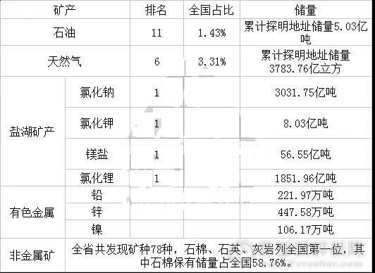已初步探明氯化納儲量3263億噸,氯化鉀4.4噸,鎂鹽48.2億噸,氯化鋰1392億噸,鍶礦1592萬噸,芒硝68.6億噸。上述儲量均居全國第1位。其中,鎂、鉀、鋰鹽儲量均占全國已探明儲量的90%以上。