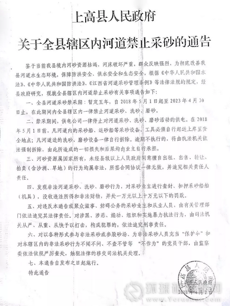 4月2日,江西省上高縣人民政府發(fā)布《關(guān)于全縣轄區(qū)內(nèi)河道禁止采砂的通告》.切實(shí)加強(qiáng)上高縣河道水生態(tài)環(huán)境,保障防洪安全、供水安全和生態(tài)安全上高縣河道采砂禁采期.自2018年5月1日起至2023年4月30日,上高縣轄區(qū)內(nèi)一律禁止河道采砂、洗砂、磨砂上高縣人民政府關(guān)于全縣轄區(qū)內(nèi)河道禁止采砂的通告.