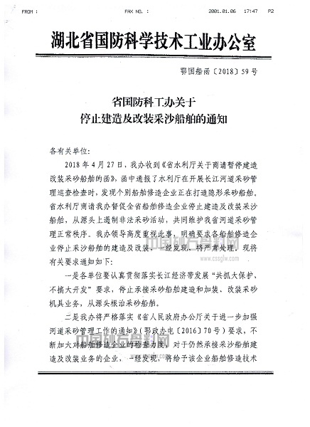 日前,湖北省國防科學技術工業(yè)辦公室發(fā)布關于停止建造及改裝采沙船舶的通知,要求湖北省所有船廠停止承接采砂船建造、加裝、改裝采砂機具業(yè)務。