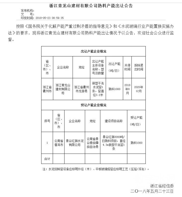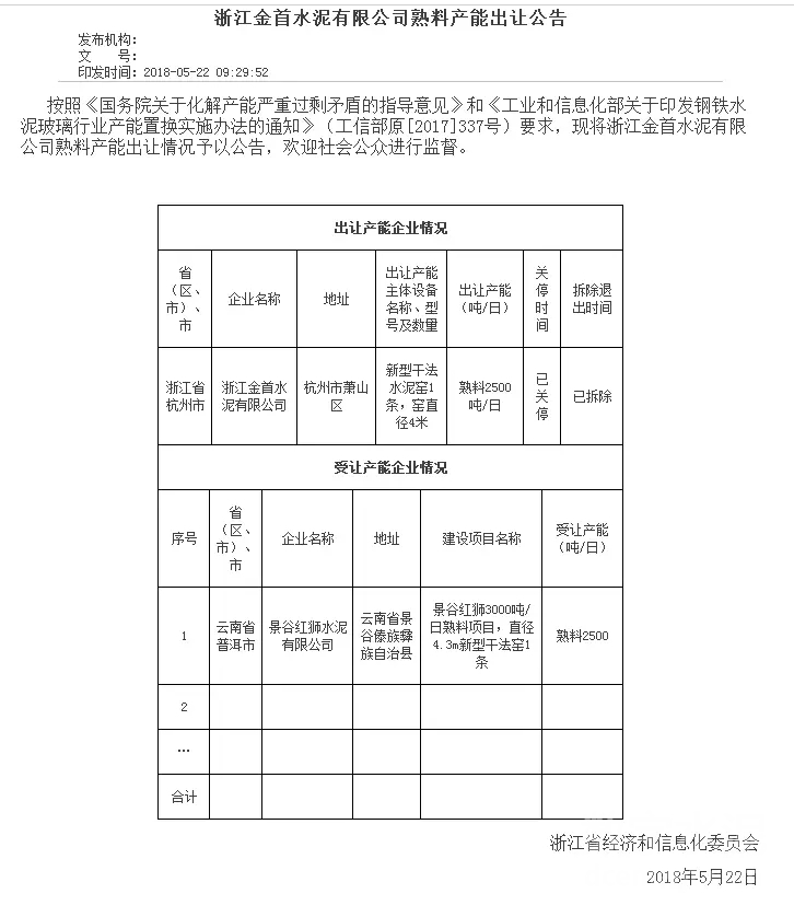 日前,浙江省經信委發布了浙江金首水泥有限公司2500t/d和浙江青龍山建材有限公司1000t/d的孰料產能出讓公告,而景谷紅獅水泥有限公司為兩家水泥企業的受讓產能企業,建設項目為景谷紅獅3000t/d熟料項目(直徑4.3m新型干法窯1條)。公告內容如下:
