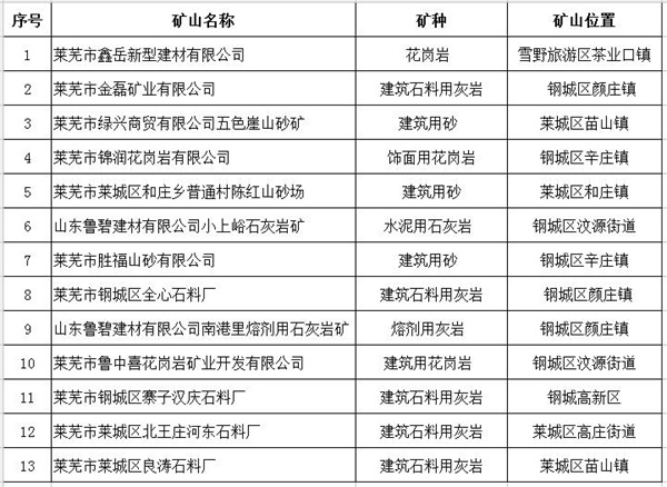 近日,萊蕪市露天開采砂石礦山綜合整治工作領導小組辦公室發布《關于公布首批升級改造驗收達標礦山名單的公告》。萊蕪市18家露天開采砂石礦山參與了綜合整治升級改造工作,經國土、環保、安監、公安、交通、水利、林業等7部門聯合驗收,首批共13家礦山通過驗收,允許完善手續后開工生產。