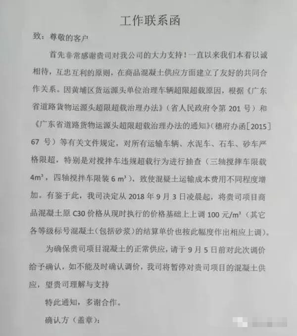 受廣東地區限載治超的影響,9月份以來,廣東多家混凝土公司發函稱,根據《廣東省道路貨物運源頭超限超載治理辦法》等有關文件規定,對所有運輸車輛、水泥車、石車、砂車嚴格限超,致使混凝土運輸成本費用不同程度增加,將各等級標號混凝土價格在現有結算基礎上上調100元/立方。