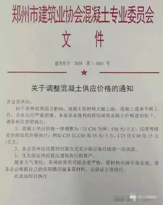 9月3日起,鄭州地區上調混凝土市場價格,C30混凝土供應價格調整為550元/方;9月4日,航空港區多家混凝土攪拌站通知上調C30混凝土價格為550元/方。