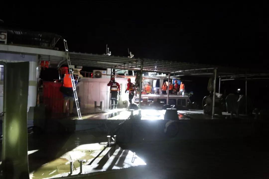 消防救援力量到達現場后,立即進行了偵查,發現被困船距離岸邊較遠,且天色很暗,試圖用橡皮艇前去營救。由于風雨較大,水流比較急,試了幾次無法靠近。后面調來執法船,由消防、海事部門組成的救援突擊隊前去營救。