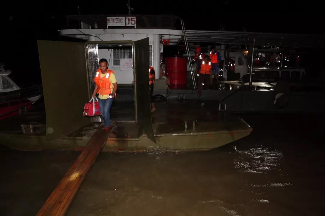 經過湍急水流,救援船慢慢靠近被困撈沙船。隨后,救援人員登上撈沙船,將船上被困人員一個個轉移至執法船。17日5時26分,成功將9人安全救離上岸。