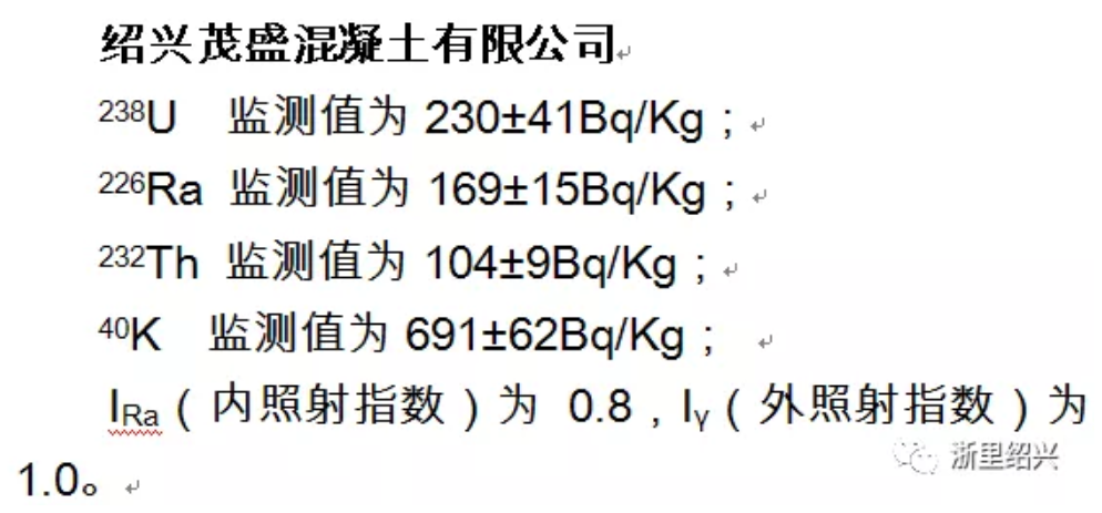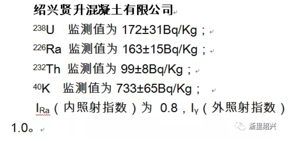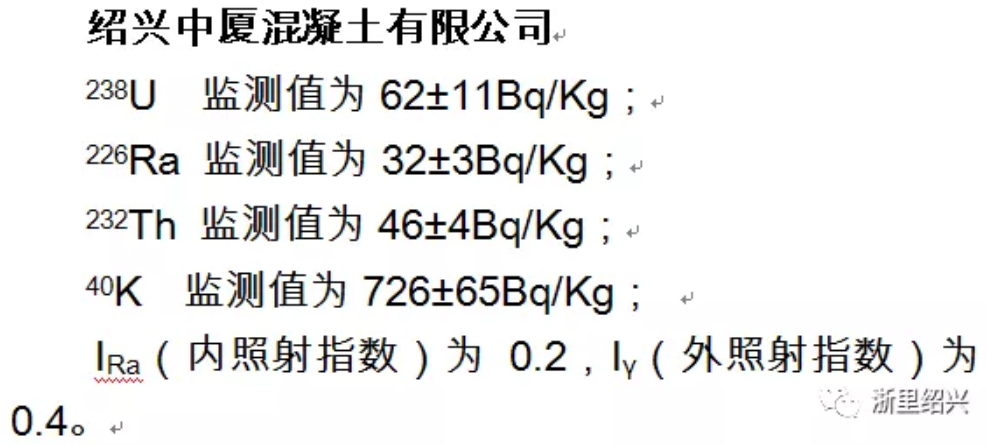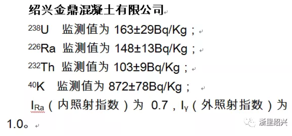 根據《高純鍺γ能譜分析通用辦法》(GB/T11713-2015),浙江輻射環境監測站(環境保護部輻射環境監測技術中心)和浙江國輻環保科技有限公司對紹興金鼎混凝土有限公司等5家混凝土企業的混凝土試塊樣品進行了放射性核素監測,監測結果如下: