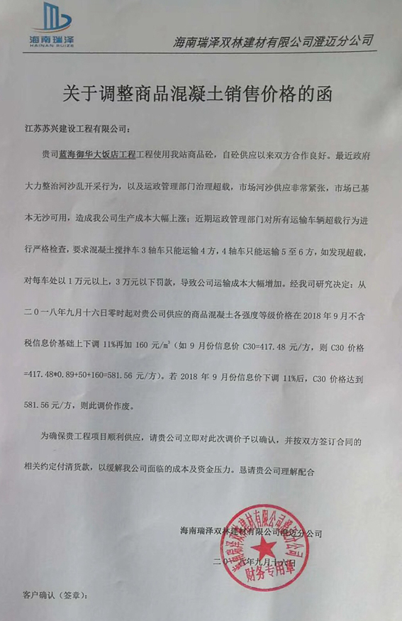 日前,澄邁一建材公司發函從2018年9月16日起,對商品混凝土各強度等級價格在2018年9月不含稅信息價基礎上下調11%再加160元/方,(如9月份信息價C30=417.48元/方,則C30價格等于417.48*0.89+50+160=581.56元/方)。