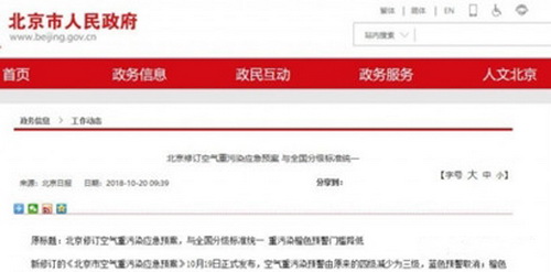據了解,10月19日新修訂的《北京市空氣重污染應急預案》正式發布,空氣重污染預警由原來的四級減少為三級,藍色預警取消;橙色預警啟動條件降低。橙色預警啟動時,建筑垃圾、渣土、砂石運輸車輛禁止上路行駛,但清潔能源汽車除外;并要求,停產減排不再“一刀切”。