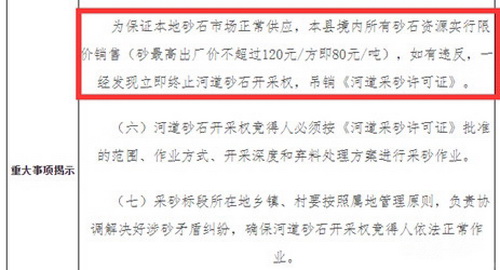 采砂點兩年開采權公開出讓,其中對河砂價格明文規定:為保證本地砂石市場正常供應,本縣境內所有砂石資源實行限價銷售(砂最高出廠價不超過120元/方即80元/噸),如有違反,一經發現立即終止河道砂石開采權,吊銷《河道采砂許可證》。