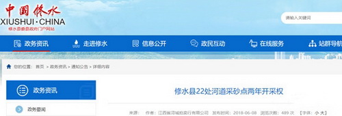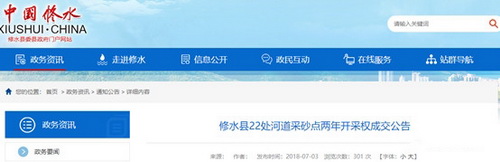 2018年7月3日,江西九江修水縣22處河道采砂點兩年開采權成交結果進行了公告。