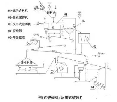 圓錐式破碎機系統、顎式破碎機+反擊式破碎機+立軸破碎機系統和顎式破碎機+圓錐式破碎機+圓錐式破碎機系統。破碎系統的選擇應根據物料特性、產品粒形和市場需求綜合考慮決定。