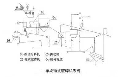 破碎系統典型的流程有:單段錘式破碎機系統、