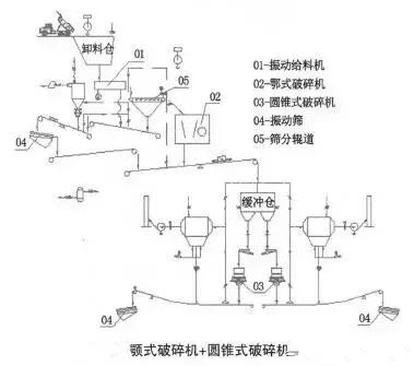 (3)顎式破碎機+圓錐式破碎機系統